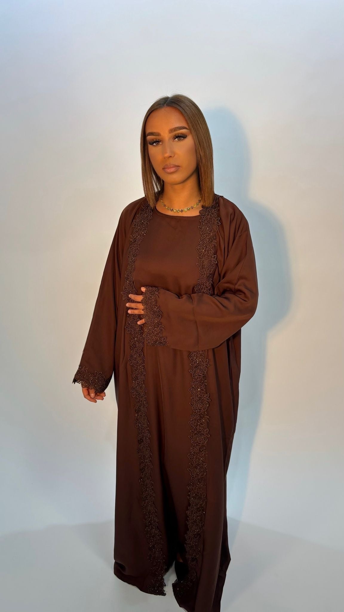 Abaya aux finitions délicates sublimant la silhouette avec subtilité.